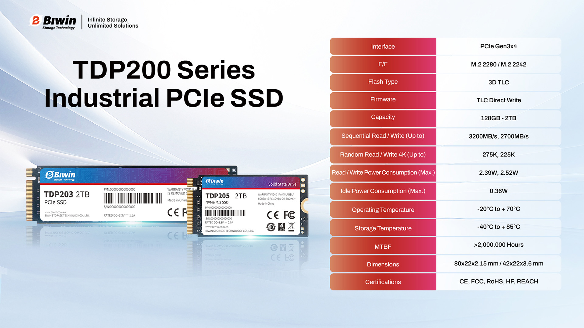 BIWIN introduces the TDP200 Industrial M.2 PCIe SSD, designed specifically for the demanding needs of industrial data transmission. With industrial-grade hardware, software, and firmware optimization, this SSD ensures reliable performance even in extreme conditions, such as 24/7 high-frequency writing and mechanical shocks. It’s perfect for applications including data communication, smart healthcare, industrial automation, robotics, and AIoT.