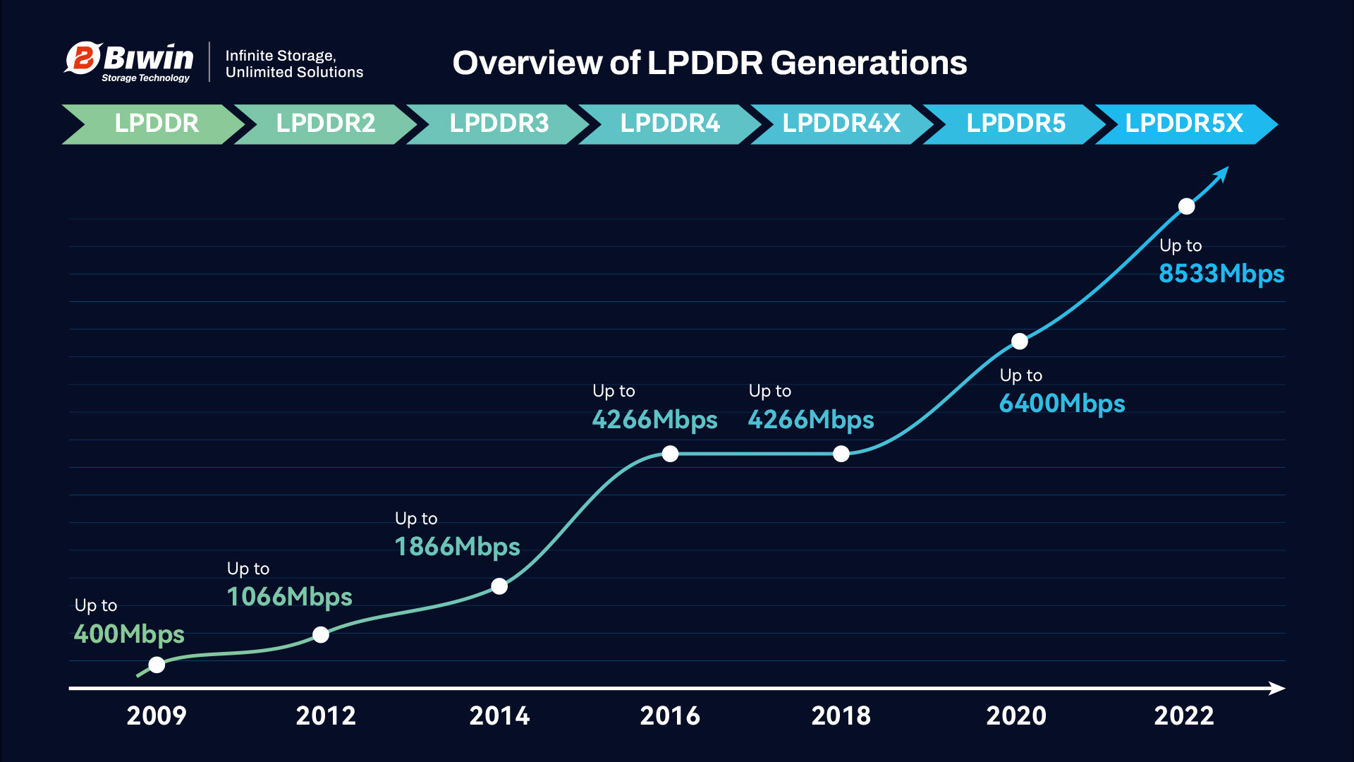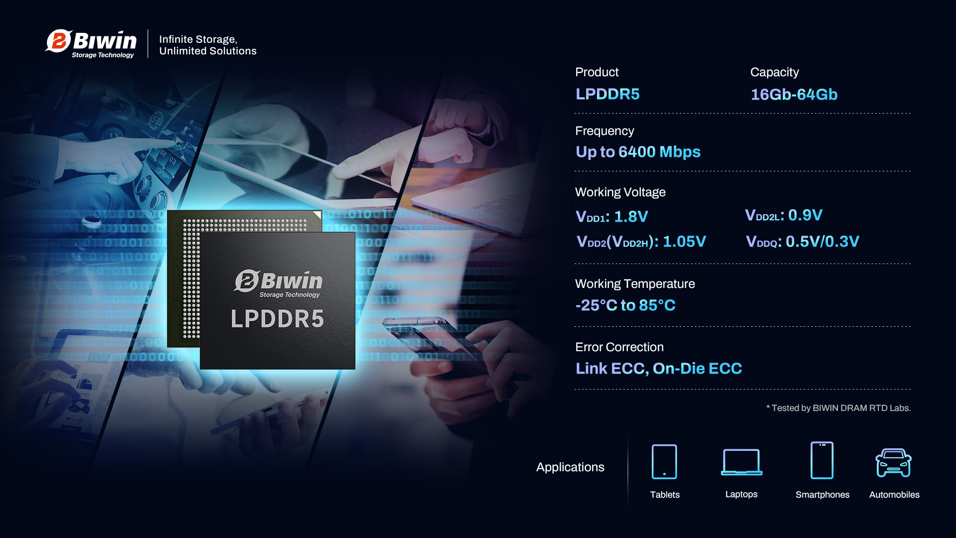 The successor to LPDDR5 memory is LPDDR5X. It offers ever greater bandwidth and lower power consumption, and Biwin offers that cutting-edge memory technology too. Where LPDDR5 has a maximum frequency of 6,400 Mbps, the Biwin LPDDR5X modules can reach 8,533 Mbps. These high-performance modules still maintain the 25% efficiency improvement over LPDDR4X, too, making them a fantastic solution for high-end smartphones, laptops, and tablets.
